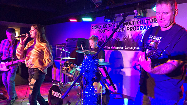 Made up of singer McKenna Murphy (second from left) and drummer Eric Goretzki (second from right), members of the Sioux Lookout Multicultural Youth Music Program, the duo play alongside their program mentors and teachers Paul Matousek (far right), guitar, and Tommy Kuzemczak (far left), youth music coordinator and bass guitarist.