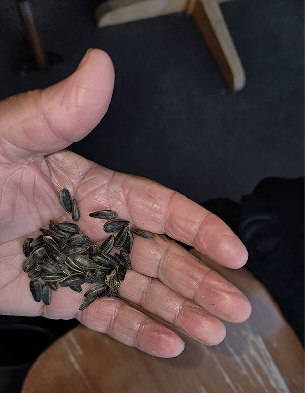 This morning, all groggy eyed and chilly when I got up, I reached into a pants pocket for my Zippo to light the morning fire and found a handful of sunflower seeds.