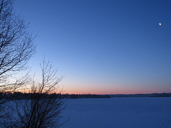 A late setting moon during the half hour before sunrise is breath taking at this time of year. This is what I saw at quarter after 6 this morning from my deck in town.