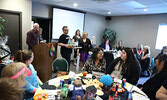 (Top photo) Auctioneer Brad Hyslop (at podium) takes bids for the items displayed by Stuart Rattai (carrying tray) and Lori Durante (holding purse).