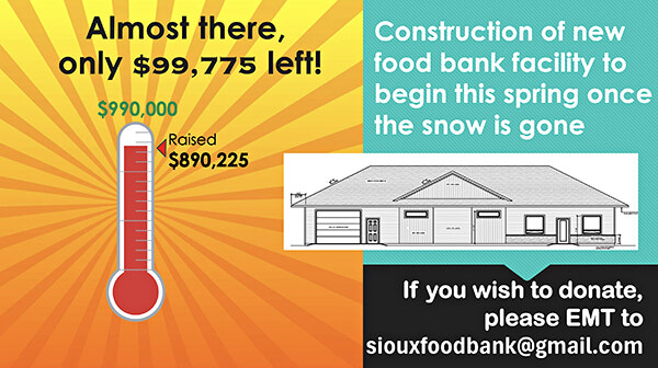 We’re in the final stretch of fundraising for the Sioux Lookout Food Bank’s new facility. There’s only $99,775 left to raise. Please give if you can.
