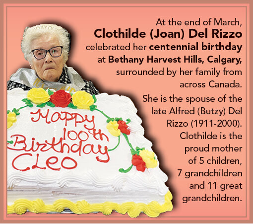 At the end of March, Clothilde (Joan) Del Rizzo celebrated her centennial birthday at Bethany Harvest Hills, Calgary, surrounded by her family from across Canada.
