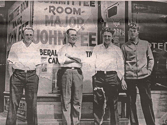 R-L: Banjo Morrison, Orville Duff, Gene Guerten and Doughy Florence standing in front of Clarke’s Hotel (most recently D&D’s Sports Bar) on Front Street in the late 1930s.