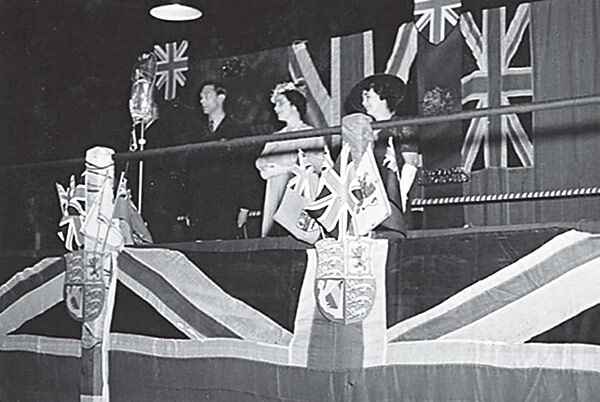 A black and white photograph of Queen Elizabeth standing on a stage that has been decked out in Union Jack flags. The photograph was taken on June 4th, 1939, when King George VI and Queen Elizabeth visited Sioux Lookout. It was estimated that over seven thousand people flocked to Sioux Lookout to witness the twenty minute long visit. Some people camped out for eight hours in advance of their majesties arrival in order to procure choice spots. During their brief visit, the royal couple were introduced to several notable citizens and were given gifts such as gold specimens found in the area. The local school children sang them “O Canada,” which was played again after by a one hundred and twenty six piece massed band.