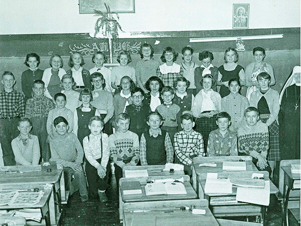 Third row from left: Danny Hayward, Mike Kolody, Kathy Nash, Jeanette Bilodeau, Lenore Pizziol, June Belmore, Cheryl Wood, Lois Belluz, Teresa Carbone, Jeannie Lorteau and Sister Gertrude.