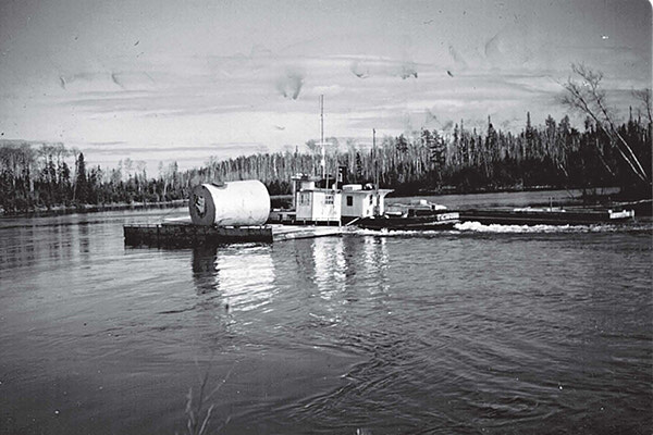 The tug is ready to round the point at crooked rapids heading for Hudson. Oct. 64.