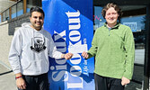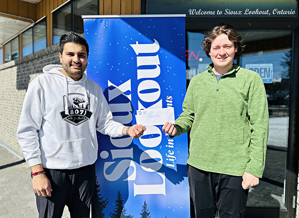 Pictured: Shop Local Selfie Contest winner August McClellan (right) receives his $500 cash prize from Ninaad Bhatt, Executive Manager of the Sioux Lookout Chamber of Commerce.
