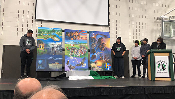Ningewance was joined on stage during the presentation to the school of his artwork by two of his four grandsons who attend the school, Joshua Slobozian and Anthony Slobozian. SNHS students Andrew Mckenzie and Jacob Linklater assisted with the unveiling of Ningewance’s work.